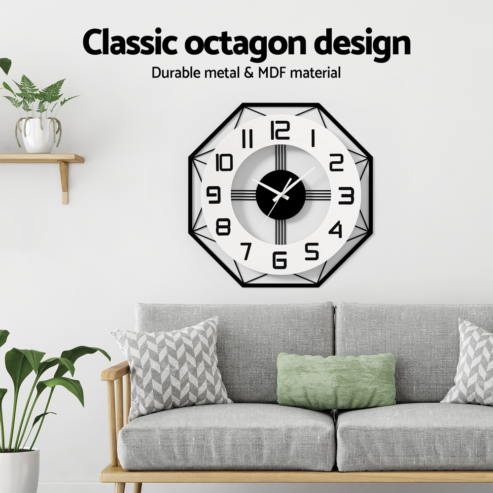 The Artiss metal wall clock adds a touch of timeless style and functionality to any room. The classic octagon design complements various décor styles, while the sturdy metal frame ensures lasting durability. The MDF clock face features clear, modern Roman numerals for easy readability, letting you keep track of time with a touch of elegance. The rust-proof finish makes it suitable for various environments, and it requires only one AA battery (not included) to keep you on schedule. This beautiful and reliable clock is the perfect addition to your living room, kitchen, office, or anywhere you need a stylish and accurate timepiece.