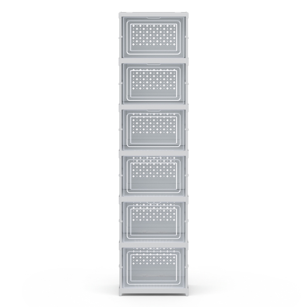 Maximise your space with this versatile Artiss shoe rack! Crafted from durable PP plastic, this 6-tier organiser offers clever shoe storage for entryways, cloakrooms, or garages. The innovative foldable design features a one-piece frame for quick setup, breathable back flaps, and see-through doors with raised handles for easy access. Each compartment holds up to 2.5KG, providing practical shoe box storage without sacrificing style. Perfect for small homes! Dimensions: 25.5×34.5x105cm. White. Assembly required (1 package).