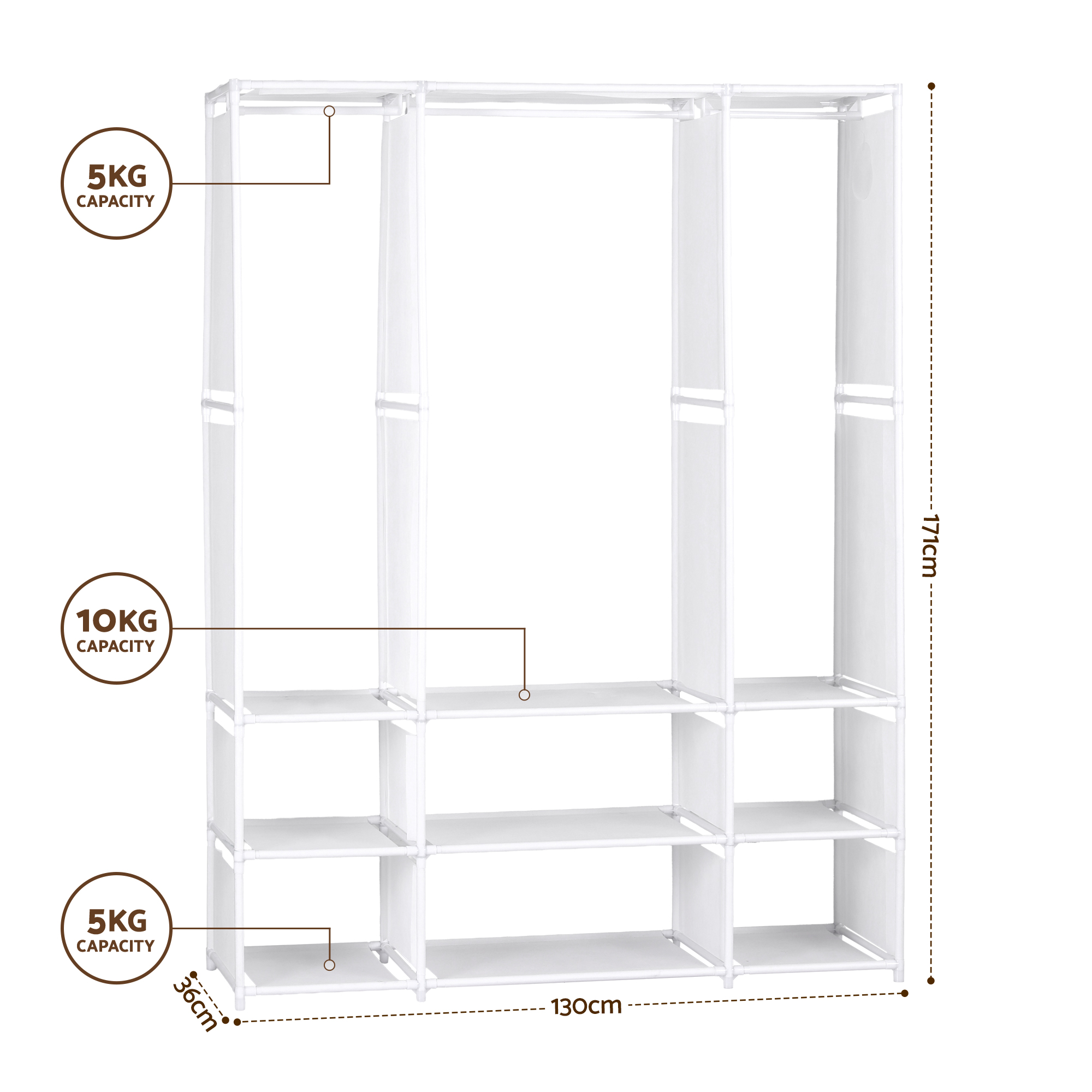 This high-capacity clothes rack features 3 strong hanging rods (supporting up to 10kg each) and 9 spacious shelves (5kg capacity each), offering ample room for your coats, shirts, and folded items. Cleverly designed, it even includes handy underneath space for storing shoes or storage boxes.