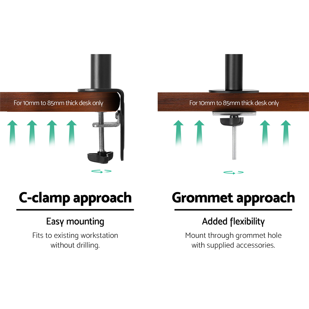Add some extended mobility to your monitor with our Artiss Fully Adjustable Dual Monitor Arm. With it, you can extend both arms up to 43cm to set your preferred viewing position and retract it with ease. Height adjustments can be easily done by twisting the height adjustment screw. It also allows you to swivel your monitor 180, rotate it 360 or tilt it up to 45 and set in either landscape or portrait format. Using the detachable VESA mount, you can mount any monitor size of up to 32″* with a maximum weight capacity of 9kg on each arm. Plus, you can also fine tune the monitors’ alignment with the VESA plate height adjustment. Other great features include alternative set ups, cable loops for neat and tidy cabling and a tools holder for allen keys. Not least, made from heavy-duty steel, the monitor arms are designed to stand up to longlasting use without missing a beat. All the necessary mounting hardware and an assembly manual are included in the package for a hassle-free set up.