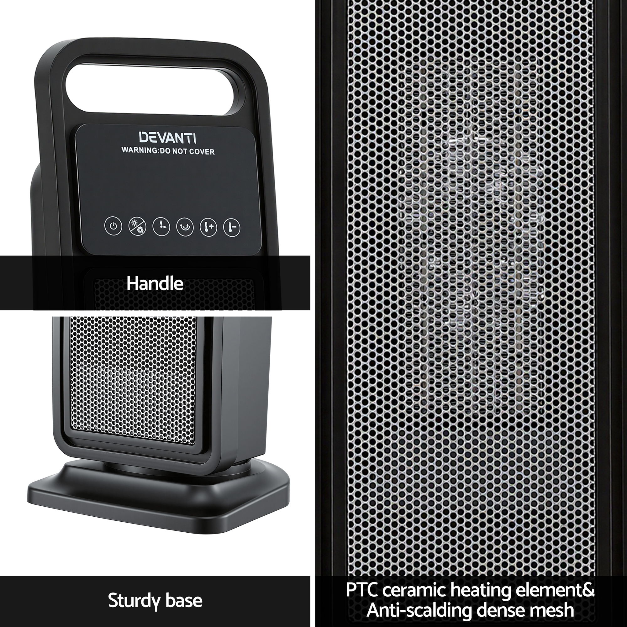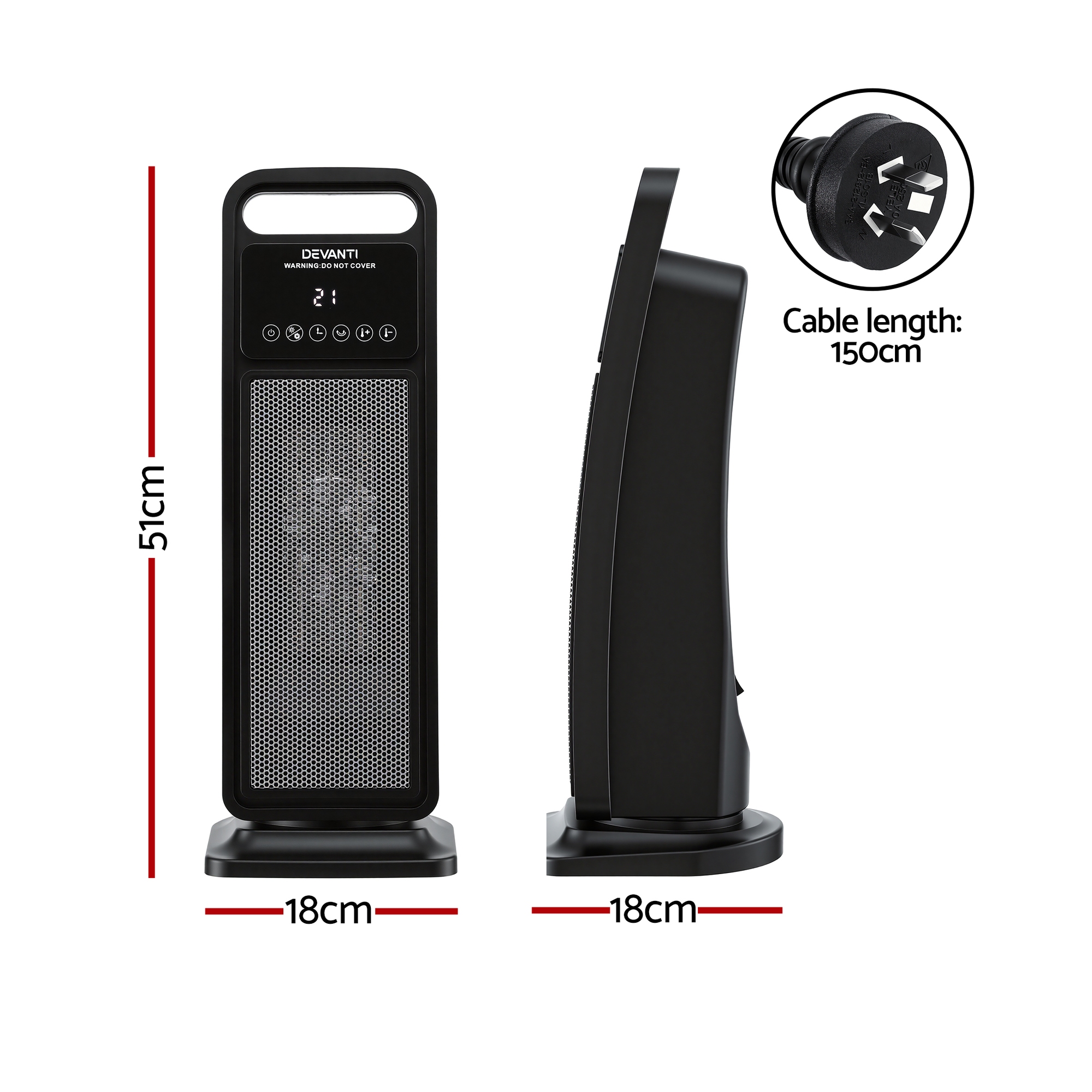 Devanti Portable Electric Space Heater: Your ideal choice for warmth and comfort on cold days. Features 3 settings (2000W/1400W/40W) and 50° oscillation for even heating. Built-in thermostat allows precise temperature control from 18-45℃ for energy efficiency. Includes 8-hour timer, tip-over and overheat protection for safety. Convenient LED touchscreen and remote control. Compact design perfect for bedroom or office use.