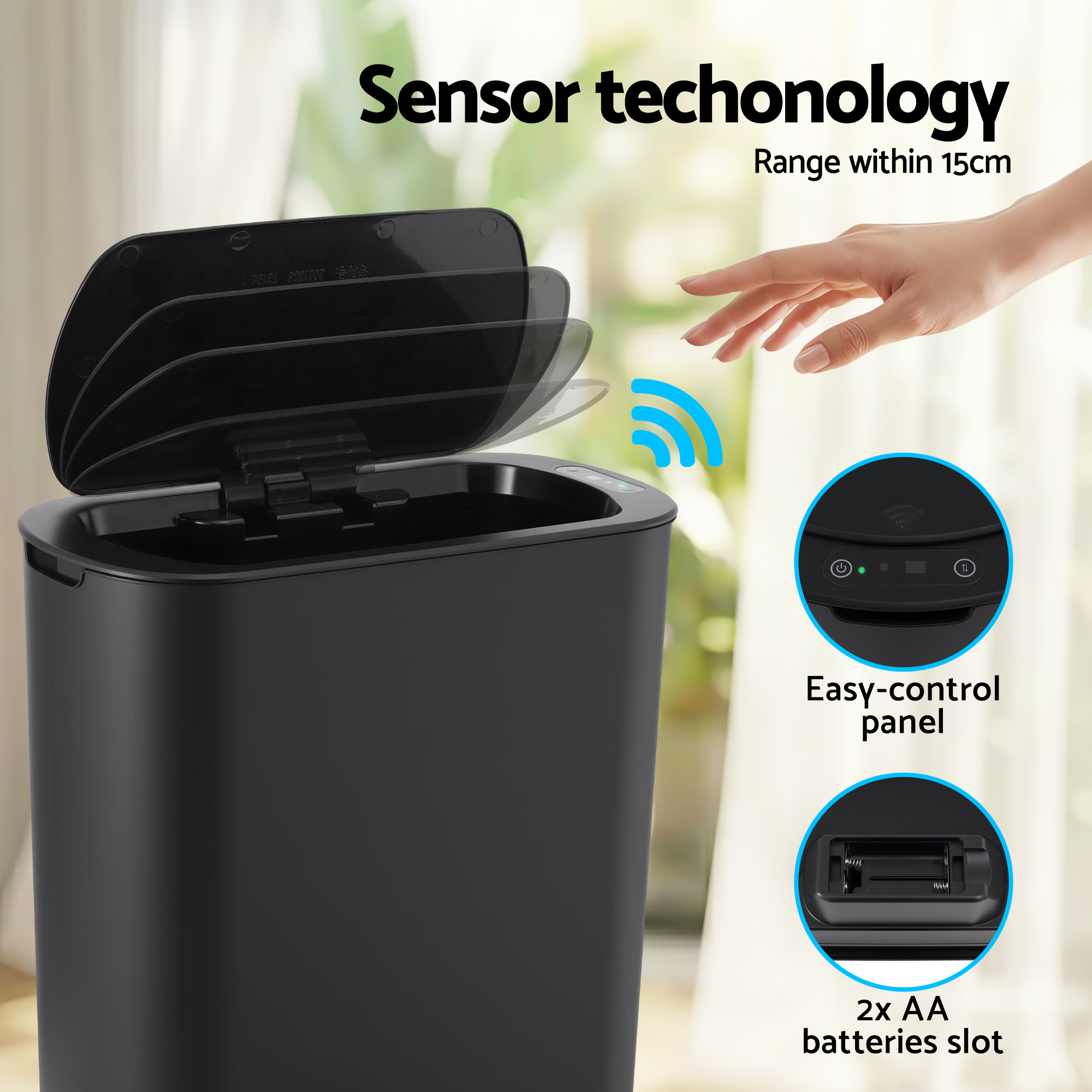 Touchless motion sensor lid opens automatically within 15–20cm