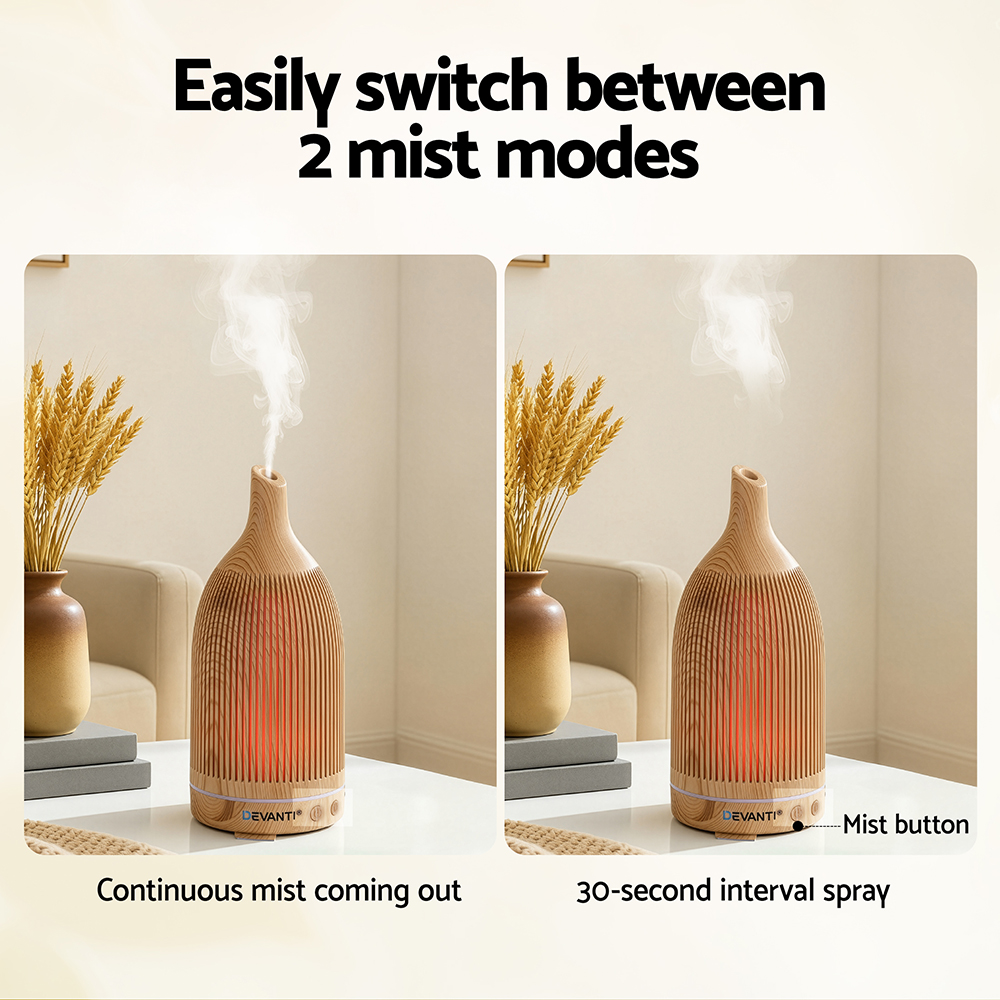 Add a touch of nature to your home with this wood grain aroma diffuser. Featuring a 200ml tank, 2 mist modes, and 2 timer settings, it creates a relaxing atmosphere with your favorite essential oils. Cycle through 7 LED colours with 2 brightness levels to set the perfect mood day or night. Whisper-quiet operation, automatic shut-off when water runs low, and low energy consumption make it safe and convenient for daily use. Perfect for bedrooms, living rooms, offices, or as a thoughtful gift.