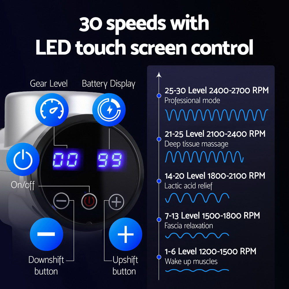 Whether you’re a hard-core gym junkie, a dedicated office worker or recovering from an injury, you’ll find relief with an Everfit Massage Gun. With a powerful high-torque brushless motor, the massage gun allows for high-frequency vibration at 1200-2700 strokes per minute and penetrates deeply for muscle relaxation from the comfort of home. The massage gun uses long-lasting and efficient rechargeable lithium batteries that allow the gun to run for up to 2 hours. There are 30 speed levels to suit various purposes; from simply waking up your muscles to relieving lactic acid and assisting muscle recovery after exercising, or even intense professional-level massages. The non-slip rubber handle provides a comfortable grip to reduce hand fatigue, and the device operates quietly for a comfortable massage experience. The smart touch LED display makes it easy to customize your massage experience. With six unique head attachments, the Everfit Massage Gun can help you dissipate fatigue, relax your muscles and relieve neck and back pain. Gets yours today and continue your fitness journey in comfort.