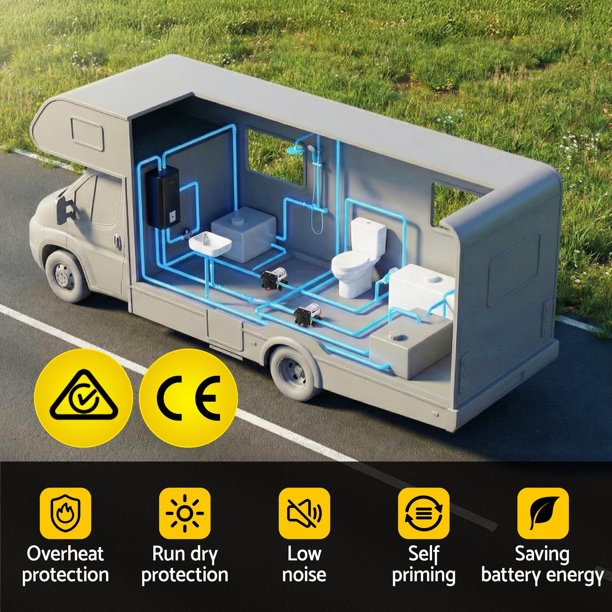 Smart, Automatic, and Safe Equipped with an automatic pressure switch, the pump activates instantly when a tap is turned on and shuts down when it’s off, providing a “city-water” experience even when you’re off-grid. Safety is our hallmark; with run-dry and thermal overload protection, your motor is shielded from damage during long hauls or unexpected water shortages.