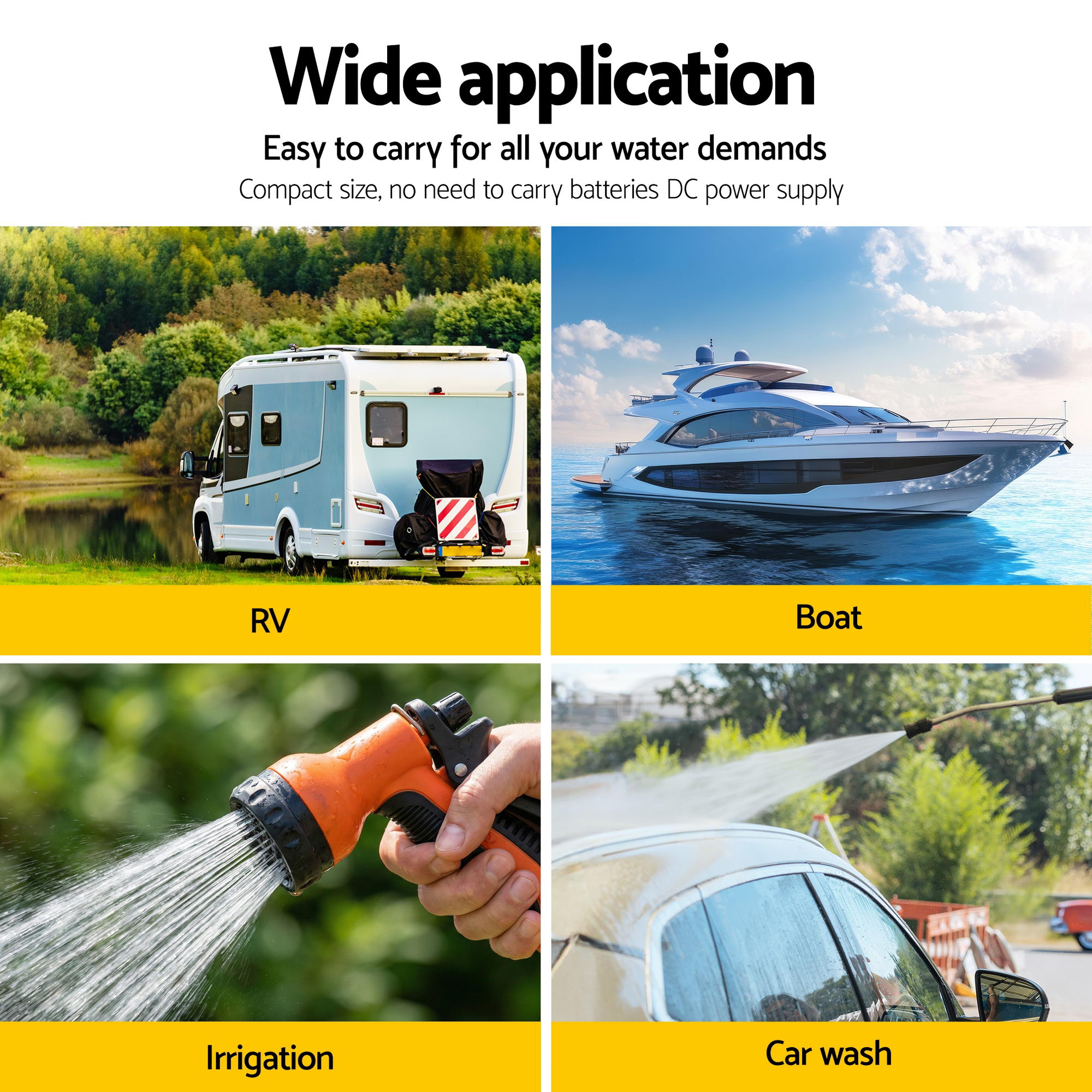 Designed for Your Yacht, Garden, and Home Whether you’re detailing your car, watering the garden, or maintaining a yacht, the Giantz pump’s compact and quiet design makes it the perfect fit. This reliable 12Volt DC fresh water pump is a direct replacement for standard RV water pumps, ensuring your next outdoor adventure is as comfortable as being at home.