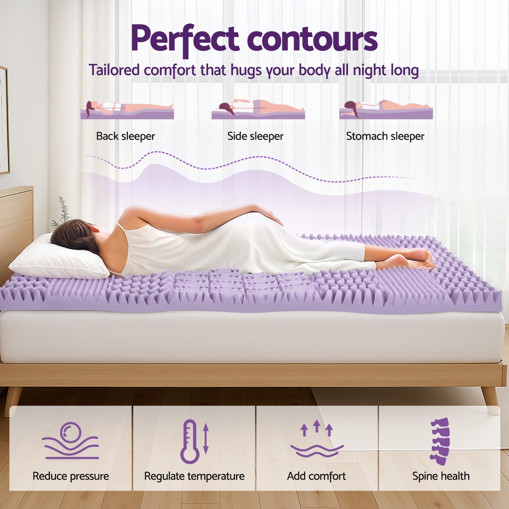 Transform your bed into a haven of comfort with the Giselle Bedding 8cm Memory Foam Mattress Topper. Infused with calming lavender, the plush memory foam promotes deeper relaxation and restful sleep. Its 7-zone contoured design targets key pressure points, ensuring customised support for your head, shoulders, back, hips, and legs.