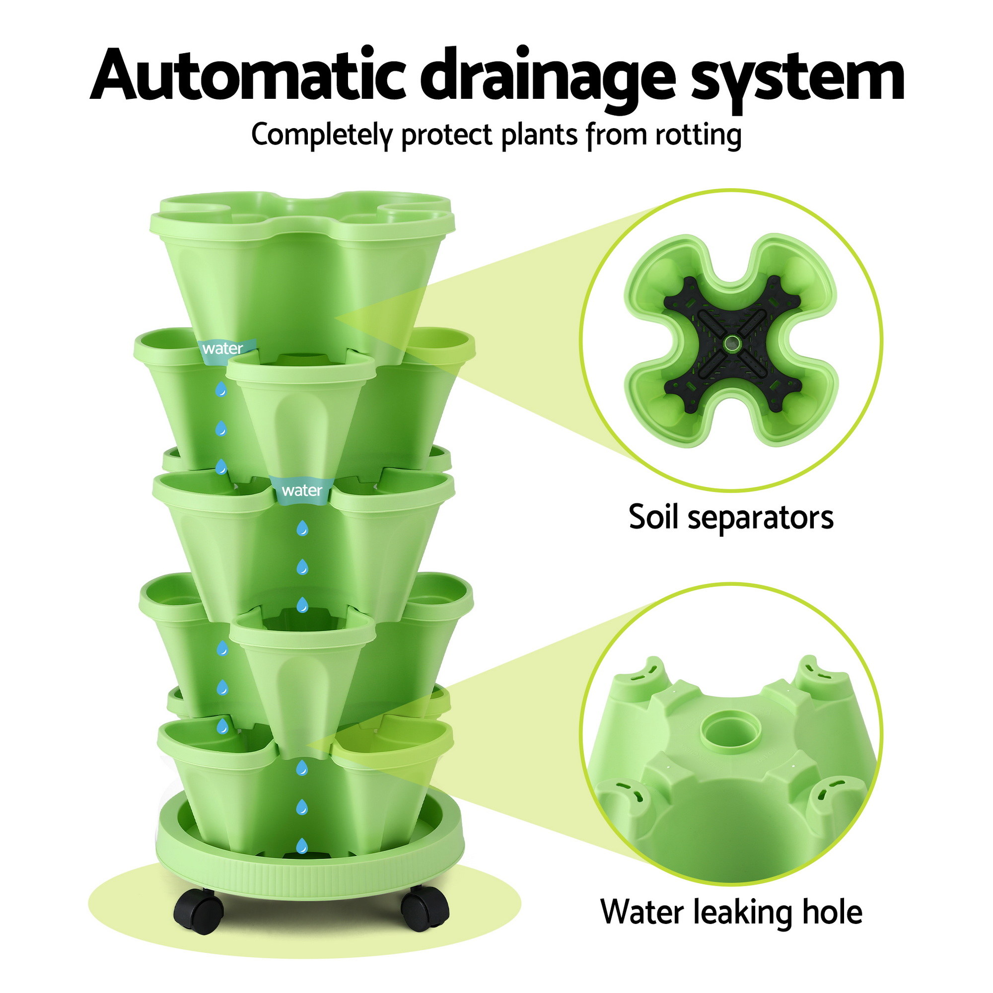 Advanced Root Health and Protection Our integrated Automatic Drainage System takes the guesswork out of watering. Each tier is equipped with specialized soil separators and drainage holes that allow water to cascade through the layers, preventing waterlogging and ensuring your herbs and strawberries grow in a perfectly balanced environment.