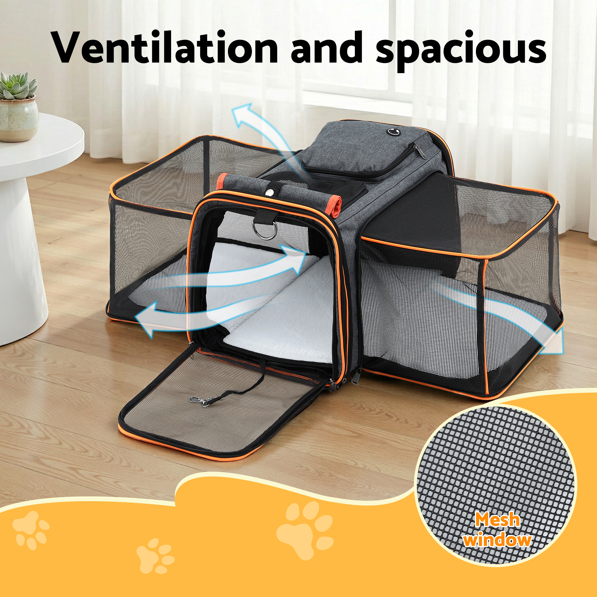 Planning a trip with your furry mate? The i.Pet Premium Pet Travel Bag is the ultimate solution for safe, comfortable, and stress-free journeys, whether you’re heading to the vet or flying interstate. Designed with both your pet’s comfort and your convenience in mind, this carrier is built to handle the lifestyle.The durable, high-quality polyester material is built to last, and the built-in safety clip ensures your pet remains secure throughout the journey.Expandable Comfort and Ventilation Give your pet extra room to stretch out with the innovative two extension sides that zip out easily. The carrier maintains excellent airflow and visibility thanks to the breathable and see-through mesh window panels. This spacious design, coupled with the removable and washable mat, ensures a comfortable environment for pets up to 10kg.Smart and Convenient Features Getting your pet in and out is simple with two entrances for easy entry and exit. The smooth and easy to open zipper provides quick access. For carrying, the bag offers versatility with an adjustable shoulder strap (approx. 76-115cm) and a durable handle. Keep essentials handy with the top and side storage pocket. When the adventure is over, the foldable and portable design allows it to collapse neatly to just 46cm x 32cm x 9cm for easy storage.