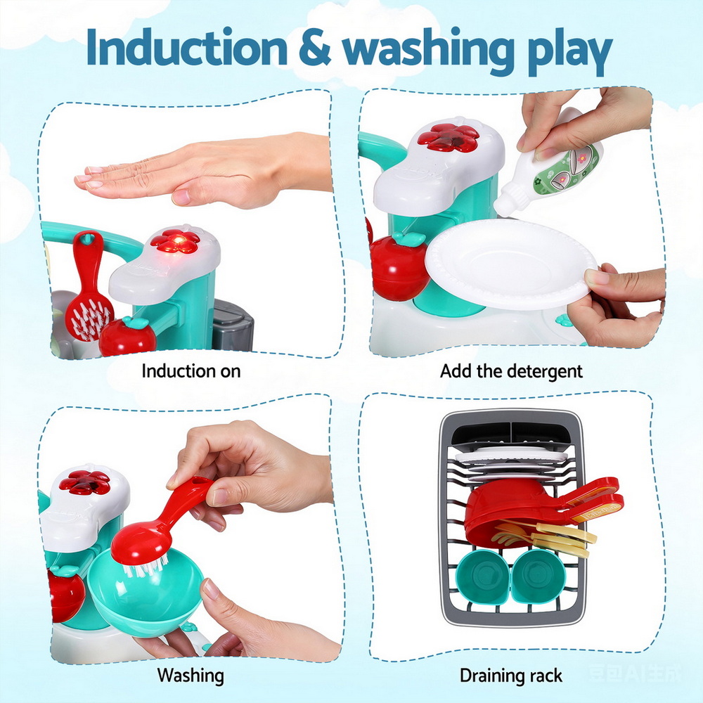 Bring real-life fun to playtime with this Kids Pretend Play Sink Toy! It features sensor control, realistic washing functions, and an automatic water cycle system for endless interactive play. The removable legs design lets kids play on the floor or tabletop. With induction and washing play, children can experience a lifelike kitchen routine while improving hand-eye coordination and social interaction. Includes rich accessories for imaginative role play (battery not included) — perfect for fun parent-child time!