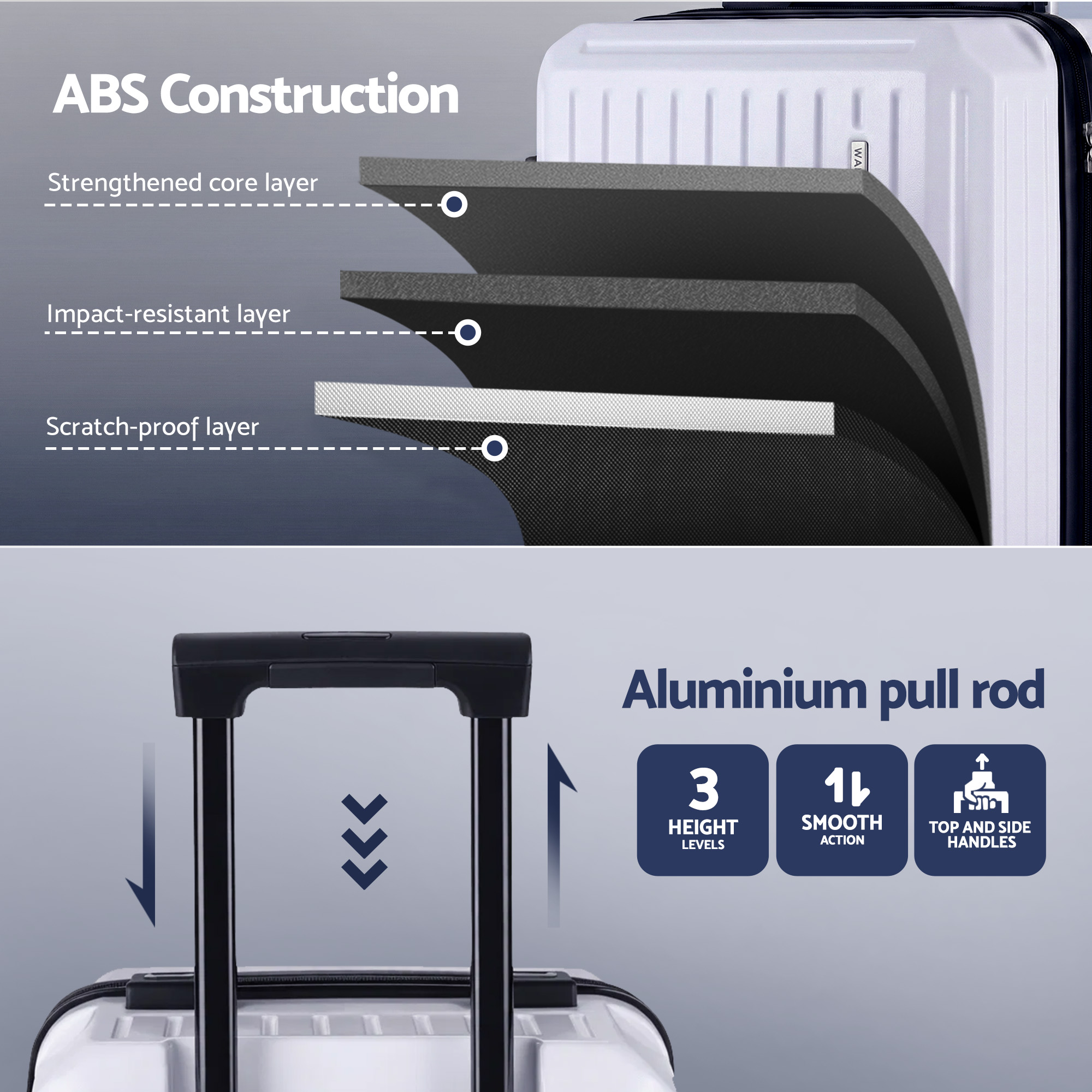 Wanderlite Trunk Luggage Set makes packing a dream, not a chore. With its innovative 3/7 split compartment, you’ll conquer clutter, while phone holder and intimate side hook keep you more convenient on the go. Glide effortlessly with reinforced 360° spinner wheels and rest easy knowing your gear is safe thanks to the TSA lock and durable ABS shell. Plus, a hidden wet compartment keeps everything fresh.
