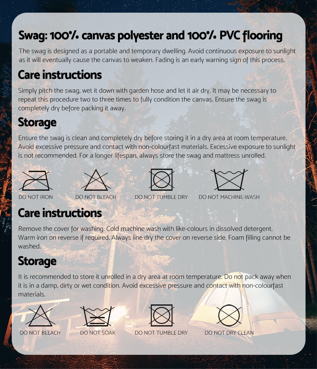 A 14oz 400gsm water-repellent Rip stop canvas cover, 500gsm PVC flooring and an extra 10cm high edge all round. Swagspeak for the ultimate tear-resistant waterproofing. Fully enclosed for privacy with zipped openings for fresh air anytime. Mesh panels to keep insects out.Thick aluminium support poles to hold up the entire set up.